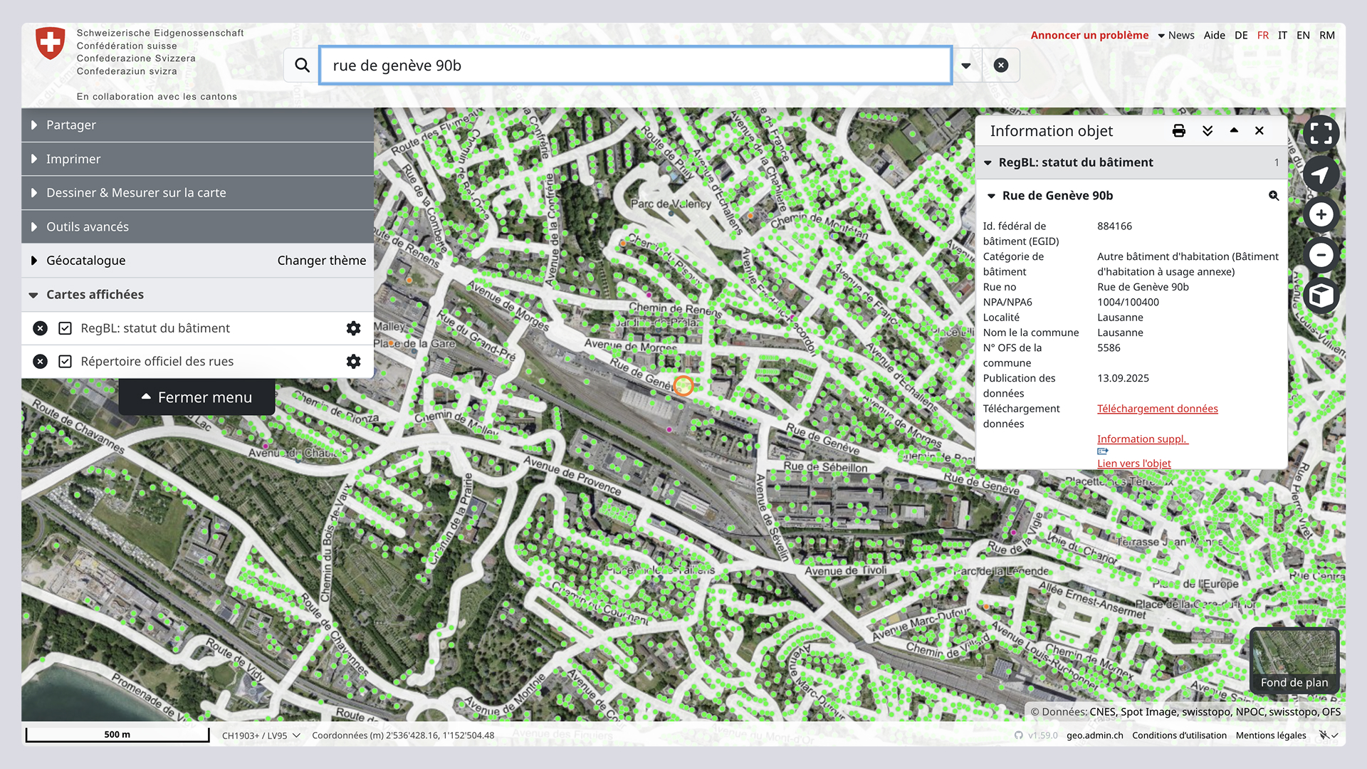 Ces informations sont continuellement mises à jour par les services communaux et cantonaux, ainsi qu’au moyen de sources telles que la mensuration officielle ou le Programme Bâtiments de la Confédération, et servent de référence dans l’administration fédérale.